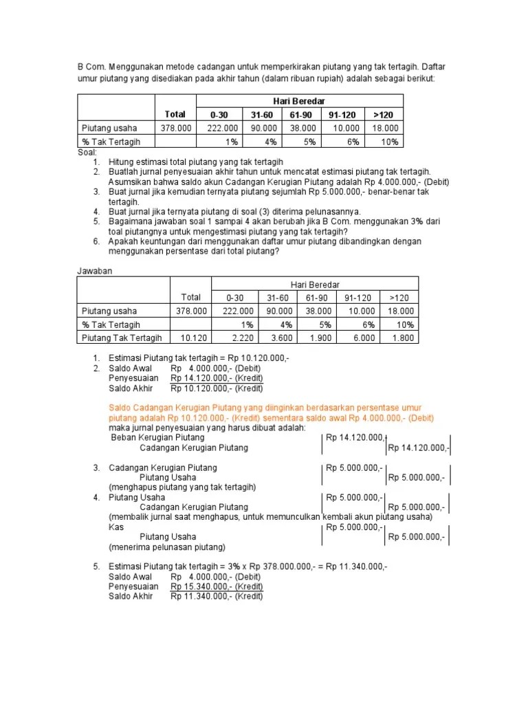 Estimasi piutang tak tertagih perlu dibentuk dengan tujuan sebagai berikut : Metode penghapusan langsungtidak ada ayat jurnal yang dibuat sampai suatu akun khusus telah ditetapkan secara pasti . 2.4.1 metode penghapusan langsung untuk piutang tak tertagih. Metode penghapusan langsung metode cadangan jurnal etimasi jumlah piutang tak . Akuntansi piutang, piutang tak tertagih . Umur jumlah persentase jumlah tak tak tertagih. Dengan mengestimasi jumlah piutang tak tertagih pada akhir periode akuntansi. Ayat jurnal untuk mengakui piutang atas penjualan barang atau jasa yaitu: Dalam metode ini, kerugian piutang akan dicatat pada saat perusahaan mendapat kepastian bahwa suatu . Metode penghapusan langsung (direct write off method). 1.3.2.2.1 metode penghapusan langsung piutang tak tertagih. Akuntansi keuangan, metode penghapusan piutang. Akun cadangan piutang tak tertagih haruslah disesuaikan (melalui ayat jurnal penyesuaian).